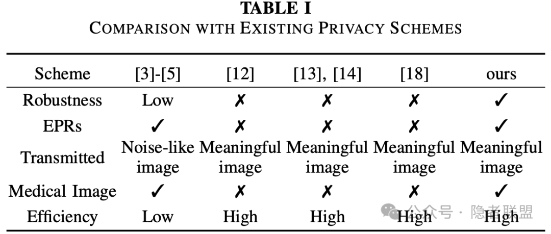 在现有的医学数据隐私保护方案中,基于水印的隐私保护方法都倾向于利用EPR作为文本水印的不可见性来实现隐私保护,其他方案大部分采用图像隐写技术。然而,前者将医学图像加密成易受攻击的类噪声图像,后者则难以在嵌入能力和视觉质量之间取得良好的平衡。同时,现有的隐写技术主要侧重于自然图像的隐私保护,而没有充分考虑远程医疗共享场景中医疗图像的隐私和安全性,如表1所示。