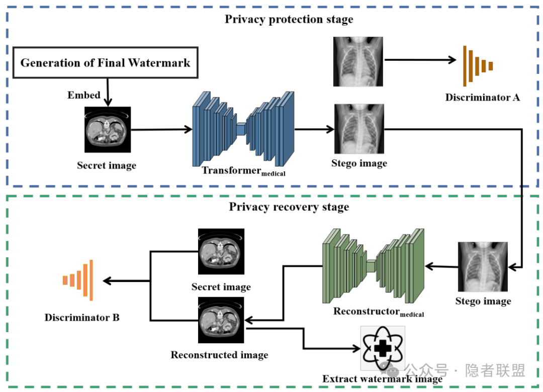 第一阶段,我们提出了一种双水印方案,即采用鲁棒的数据隐藏方法将文本和图像结合起来形成双水印,从而保证了患者身份数据的隐私性。第二阶段,提出了一种带有双水印的模态转换网络W-CycleGAN用于医学图像隐私保护。该模型通过将医学图像转换为其他有意义的医学图像进行传输来减少攻击者的怀疑。与CycleGAN不同的是,本文提出的网络具有唯一性,通过在给定医学图像的第四通道中放置双水印作为网络的输入来更新W-CycleGAN的神经网络架构,实现只有配对的CycleGAN (W-CycleGAN)才能恢复正确的医学图像。