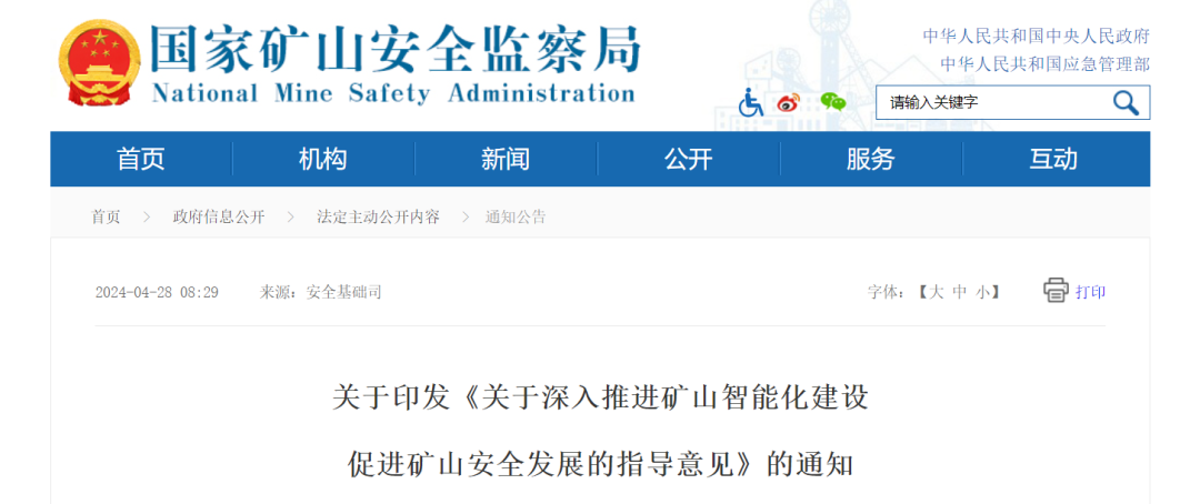 矿业是国民经济发展的重要支柱性产业,智能化建设是推动矿山安全发展、保障国家能源资源安全的重要举措。近年来,我国矿山智能化建设蓬勃发展,取得积极成效,但还存在发展不平衡、不充分、不协调等问题。为深入贯彻落实《中共中央办公厅 国务院办公厅关于进一步加强矿山安全生产工作的意见》,深入推进矿山智能化建设,促进矿山安全发展,现提出如下意见。