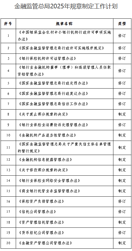 4月18日,金融监管总局发布的《金融监管总局2025年规章制定工作计划》显示,年度计划修订规章11部,制定规章9部。
