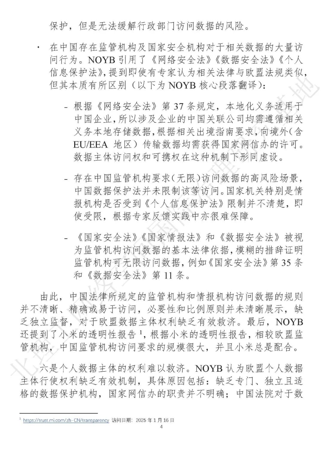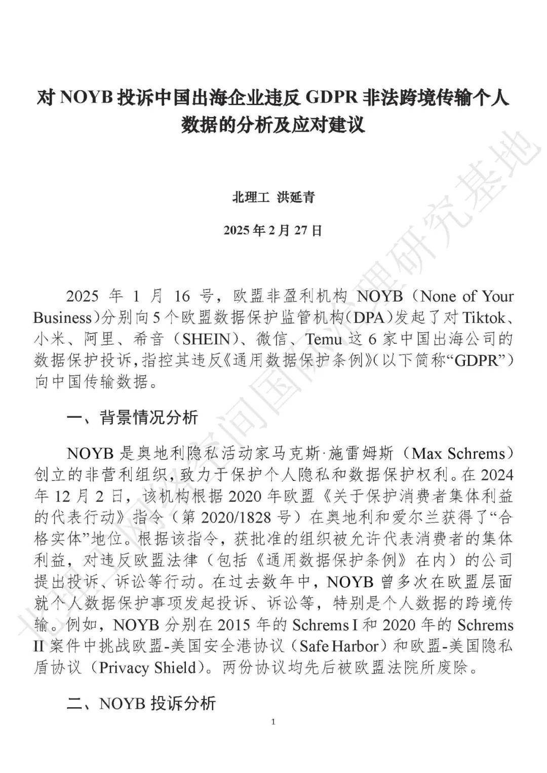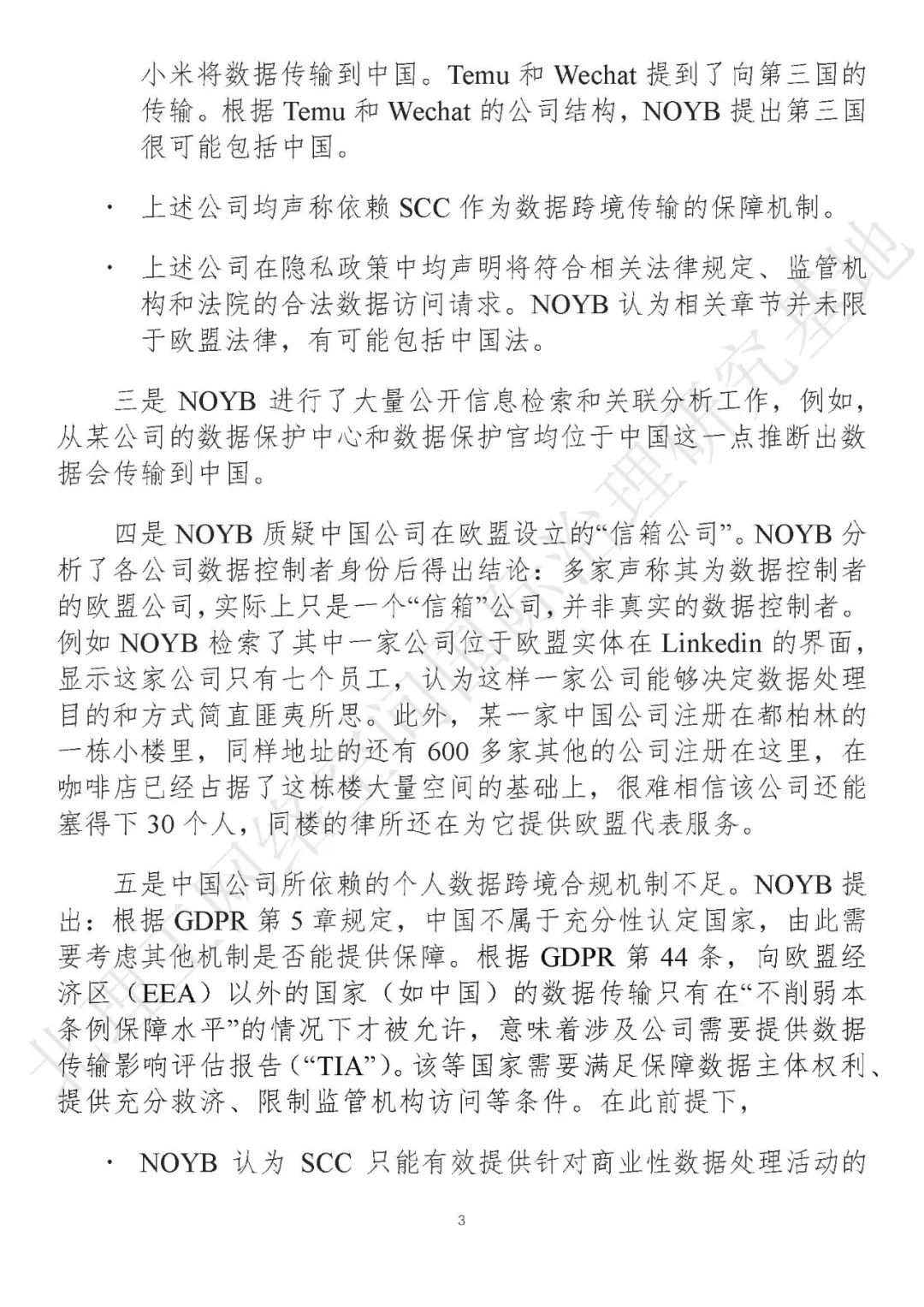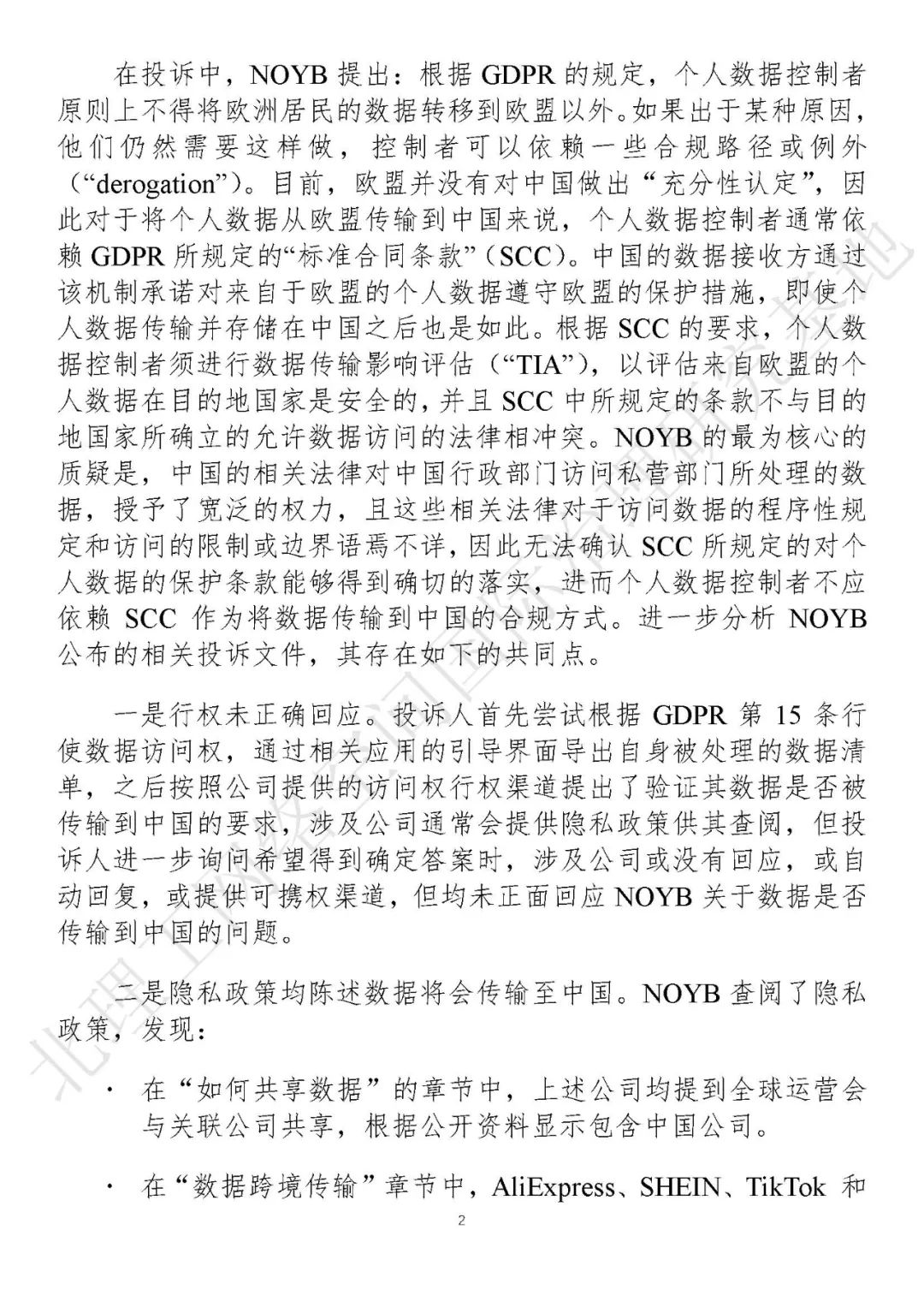 近日,爱尔兰数据保护委员会(DPC)宣布了对TikTok公司("TikTok")将欧洲经济区用户个人数据传输至中华人民共和国的合法性和透明度问题。调查后的最终裁决认定该公司在将欧洲经济区用户数据转移至中国以及透明度要求方面违反了《通用数据保护条例》。具体来说,TikTok未能证明中国员工远程访问数据时获得与欧盟同等的保护;TikTok未进行必要评估,其亦未妥善解决中国当局根据《反恐怖主义法》、《反间谍法》等法律获取欧洲经济区用户数据的可能性,且隐瞒部分数据曾存储于中国服务器的事实。该裁决包含总计5.3亿欧元的行政罚款,并责令TikTok在6个月内使其数据处理行为符合法律规定。值得关注的是,爱尔兰数据保护委员会(DPC)于2025年2月21日根据《通用数据保护条例》(GDPR)第60条规定,向GDPR合作机构提交了决定草案,该草案未收到任何异议。这说明了欧洲DPA们的统一监管态度。在该决定之前,也就是2025年1月16号,欧盟非盈利机构NOYB(None of Your Business)分别向5个欧盟数据保护监管机构(DPA)发起了对Tiktok、小米、阿里、希音(SHEIN)、微信、Temu这6家中国出海公司的数据保护投诉,同样是针对数据向中国传输,其投诉逻辑和爱尔兰DPC的决定如出一辙。公号君在此和大家分享当时写的一个报告,供大家参考。这一系列的事件,值得大家关注并寻找协调一致的解决路径。