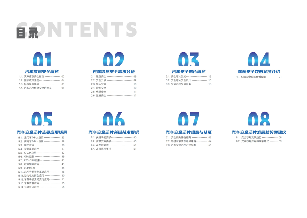 白皮书从汽车信息安全概述、汽车信息安全需求分析、汽车安全芯片概述、车端安全攻防案例介绍、汽车安全芯片主要应用场景、汽车安全芯片关键技术要求、汽车安全芯片检测与认证、汽车安全芯片发展趋势和建议等共八个章节,对汽车安全芯片的行业背景、标准进展、技术路线、发展趋势等进行了详细阐述。通过解析汽车安全芯片的应用场景、技术要求和试验方法,帮助行业各方充分厘清了汽车安全芯片技术现状和发展脉络,并给出了针对性的发展建议。
