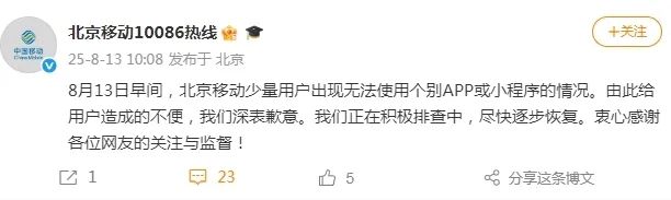 当天上午,“北京移动10086热线”官方账号发文称:“8月13日早间,北京移动少量用户出现无法使用个别APP或小程序的情况。由此给用户造成的不便,我们深表歉意。我们正在积极排查中,尽快逐步恢复。”