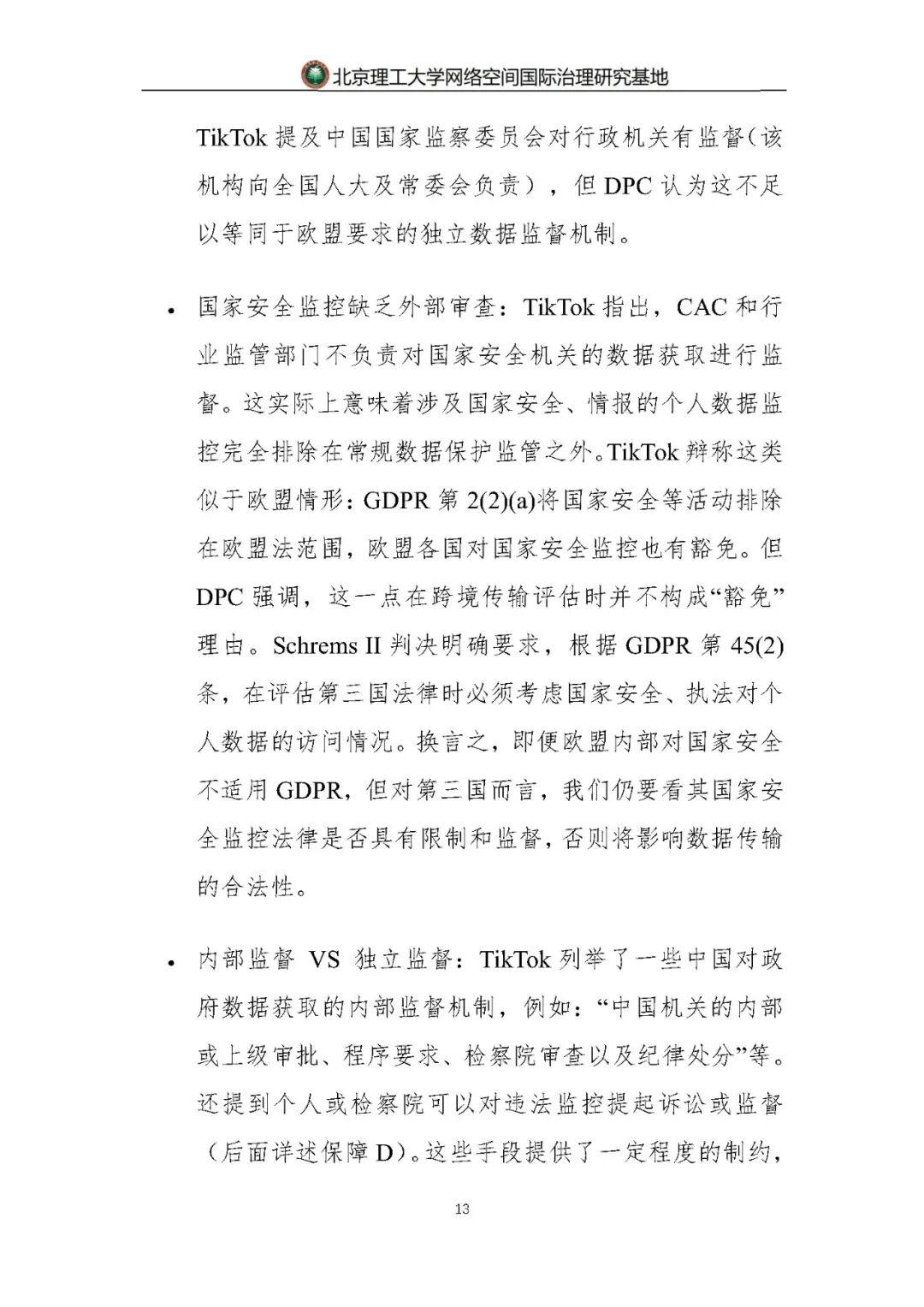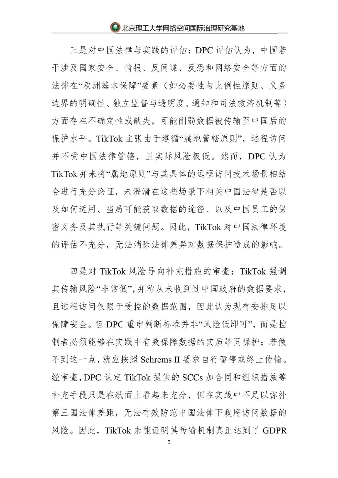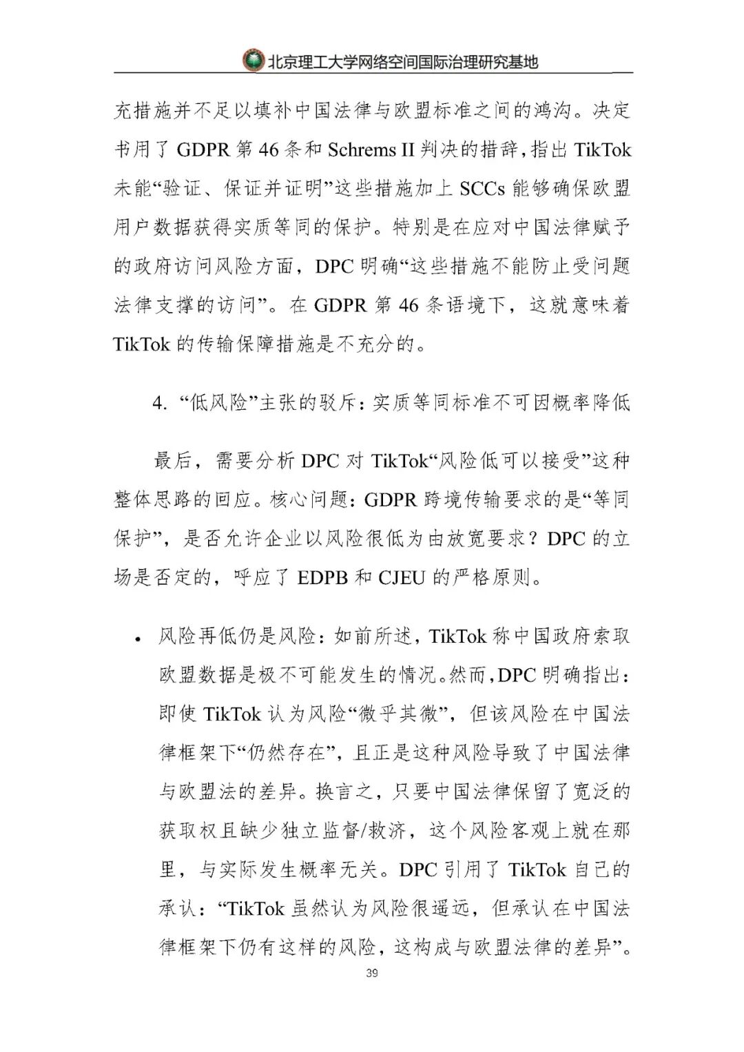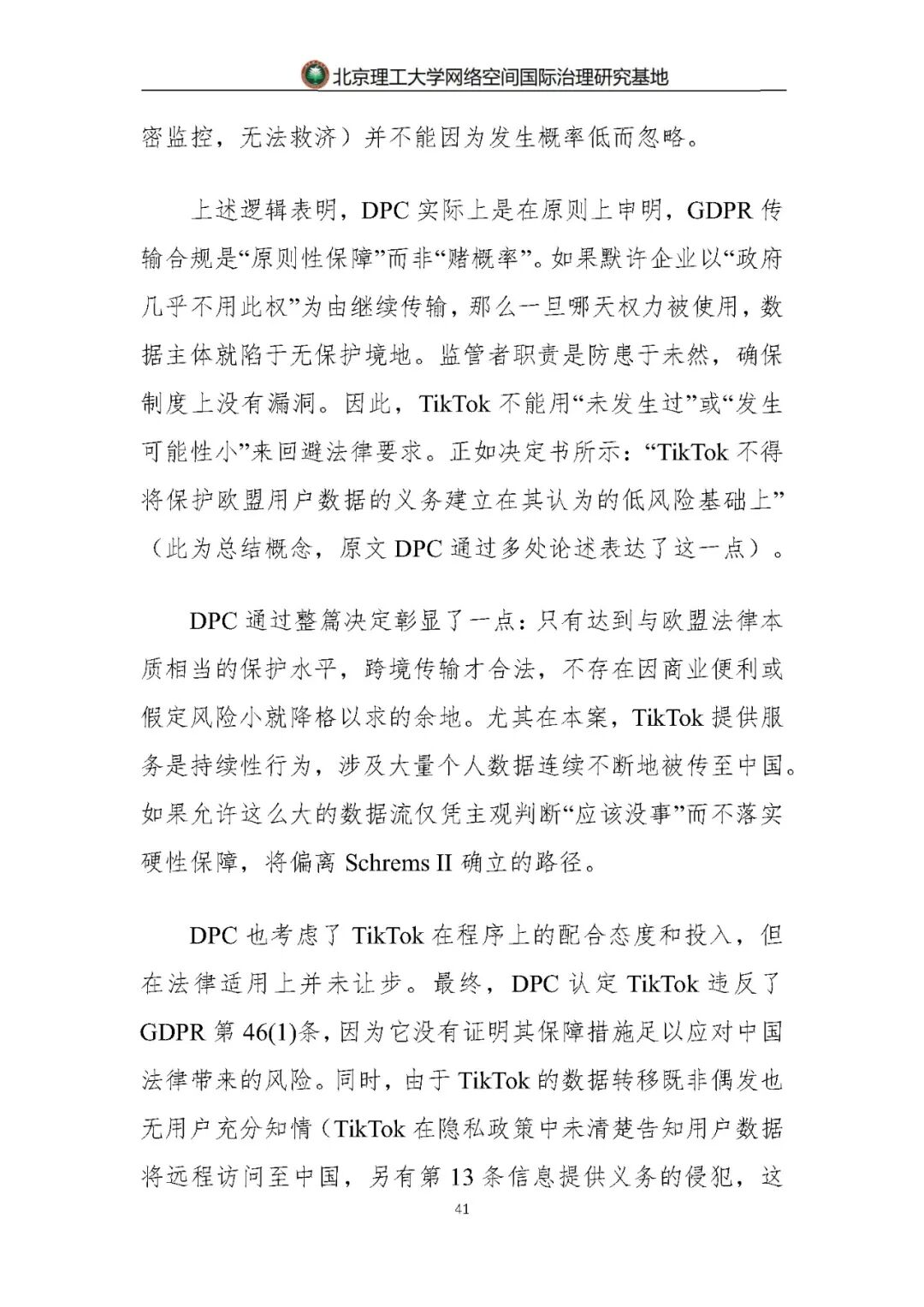 近日,爱尔兰数据保护委员会(DPC)公布了对TikTok公司("TikTok")将欧洲经济区用户个人数据传输至中华人民共和国违反GDPR的决定全文。在之前的分析【爱尔兰DPC对TT的5.3亿罚单与NOYB投诉分析和应对建议】之后,北理工团队利用国庆假期对该决定做了法律分析复盘。