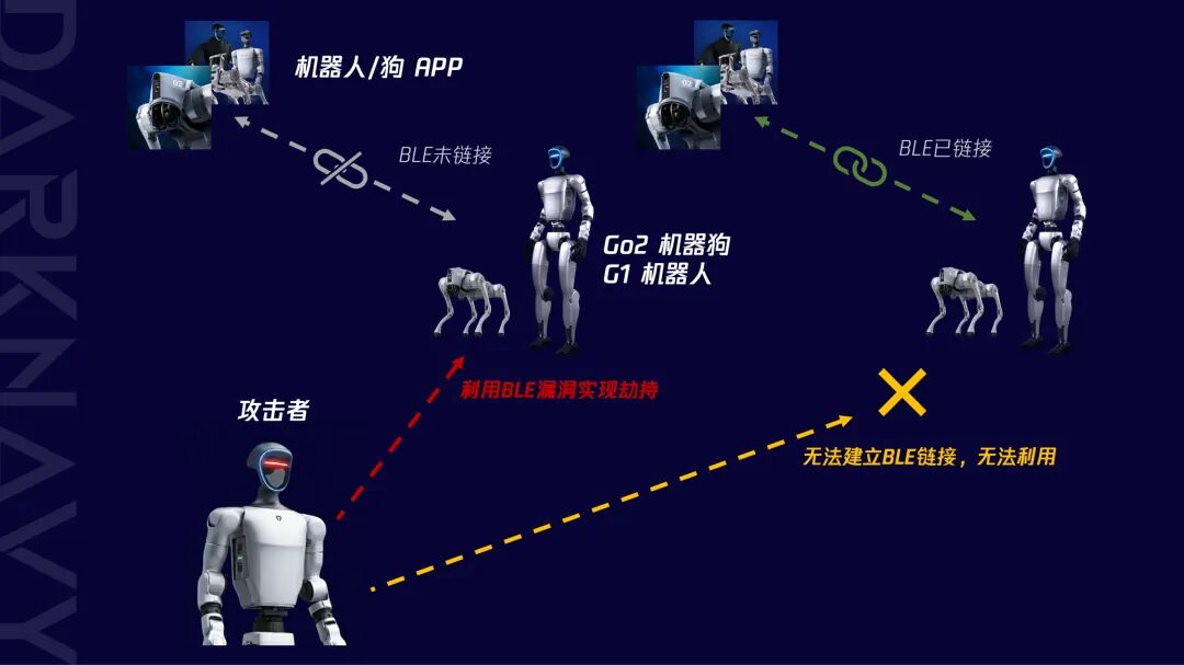 DARKNAVY在分析UniPwn后确认,该漏洞真实存在,且与我们此前报告给宇树的内容一致,成功利用该漏洞会导致机器人/狗可被近场劫持、恶意控制。