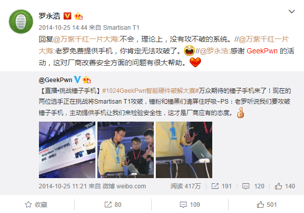 2014年首届GeekPwn大赛上,锤子手机被成功攻破