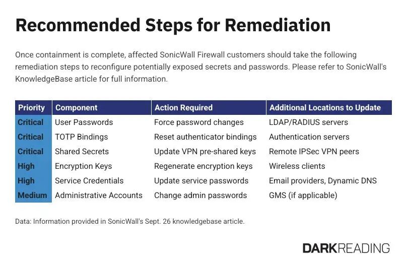优先修复“高优先级”设备,使用SonicWall提供的在线工具分析配置并重置凭证。