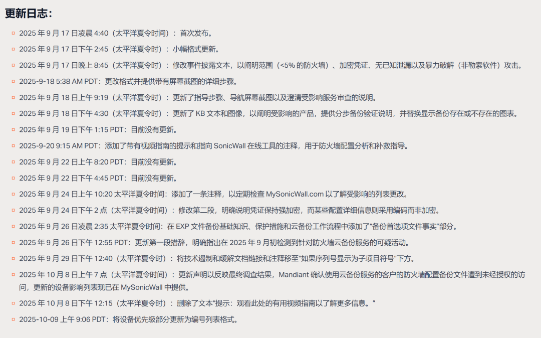 2025年9月,SonicWall首次披露其云备份服务遭遇安全事件,称仅有“不到5%的客户”受到影响。然而,持续调查显示,攻击者通过针对MySonicWall云备份API的暴力破解攻击,系统性突破了其防护机制,最终获取了所有使用云备份功能客户的防火墙配置文件。