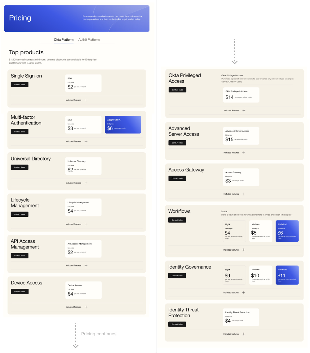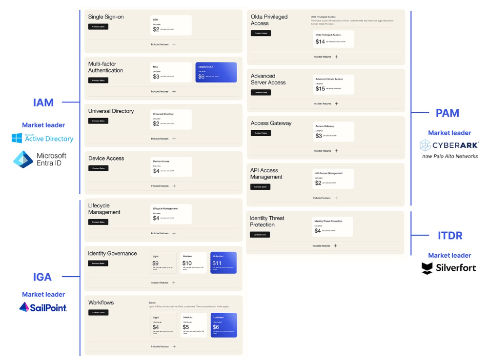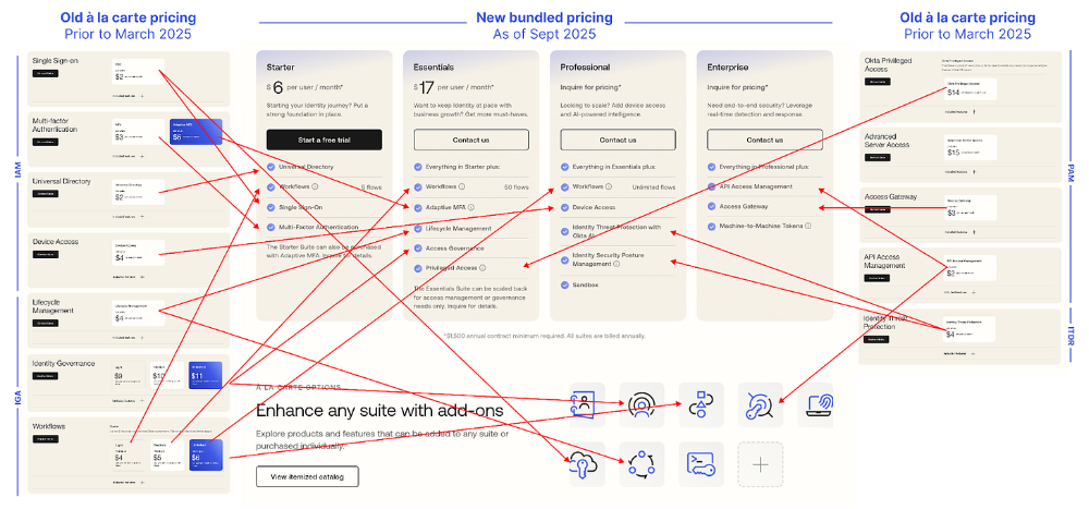Okta于2025年3月更新了定价策略—— presumably是某位市场拓展负责人意识到此前策略的失误。新版定价层级显著优化:更精准地契合不同成熟度客户的需求,同时保留点菜式选项以供销售团队灵活成交(值得一提的是,产品概述页如今对功能分类的呈现也更为清晰)。