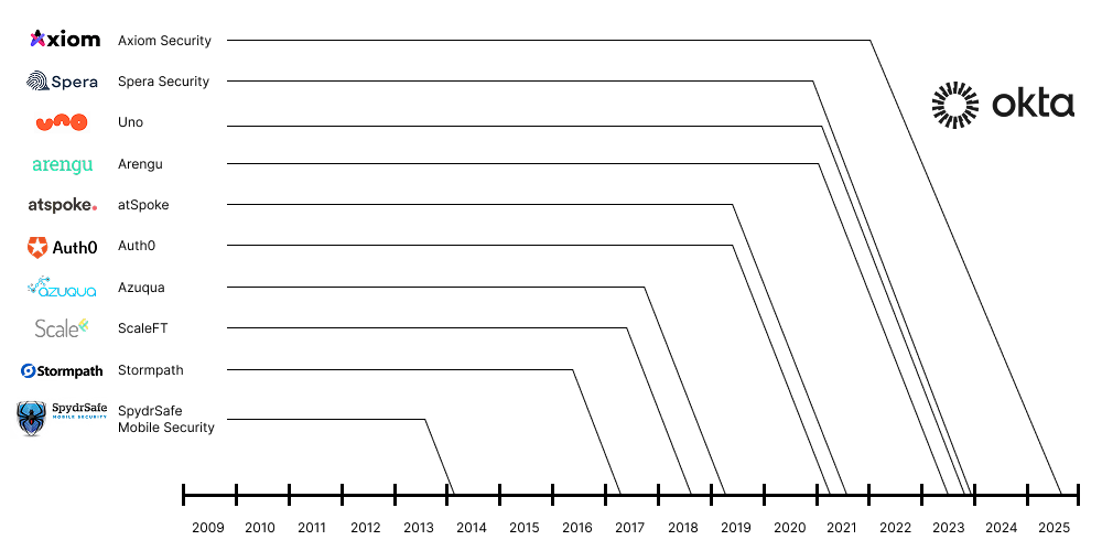 [Okta 历年收购历程。过去几年间,Okta 进行了多次收购,尤其致力于扩展其身份治理与信任(IGA)及 IT 数据管理(ITDR)产品线。若想被 Okta 收购,不妨考虑选用以 A 或 S 开头的公司名称。]