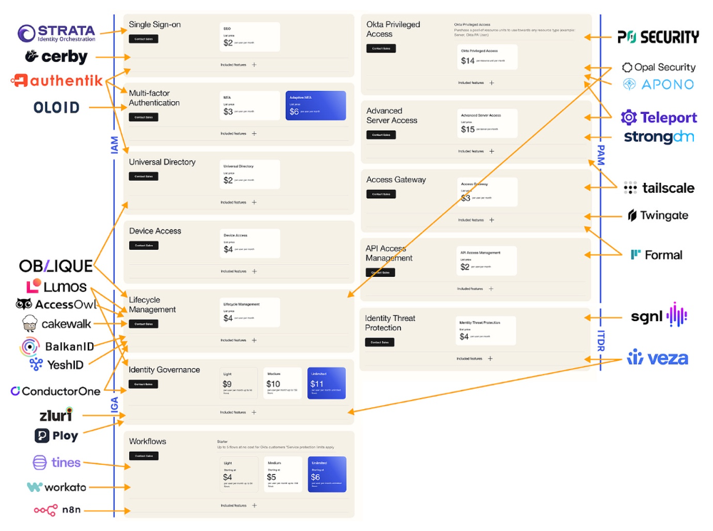 请允许我暂代Okta营销团队完成他们早该做的事:按技术范畴重新归类产品功能(尽管仍需强调:这绝非理想的定价方式)。