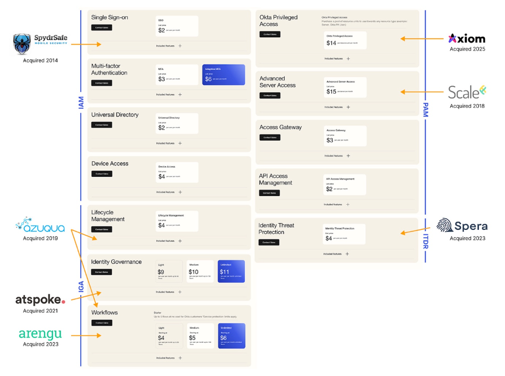 [Okta收购项目与其点菜式定价的映射关系。其IGA与ITDR能力几乎完全通过收购获得]