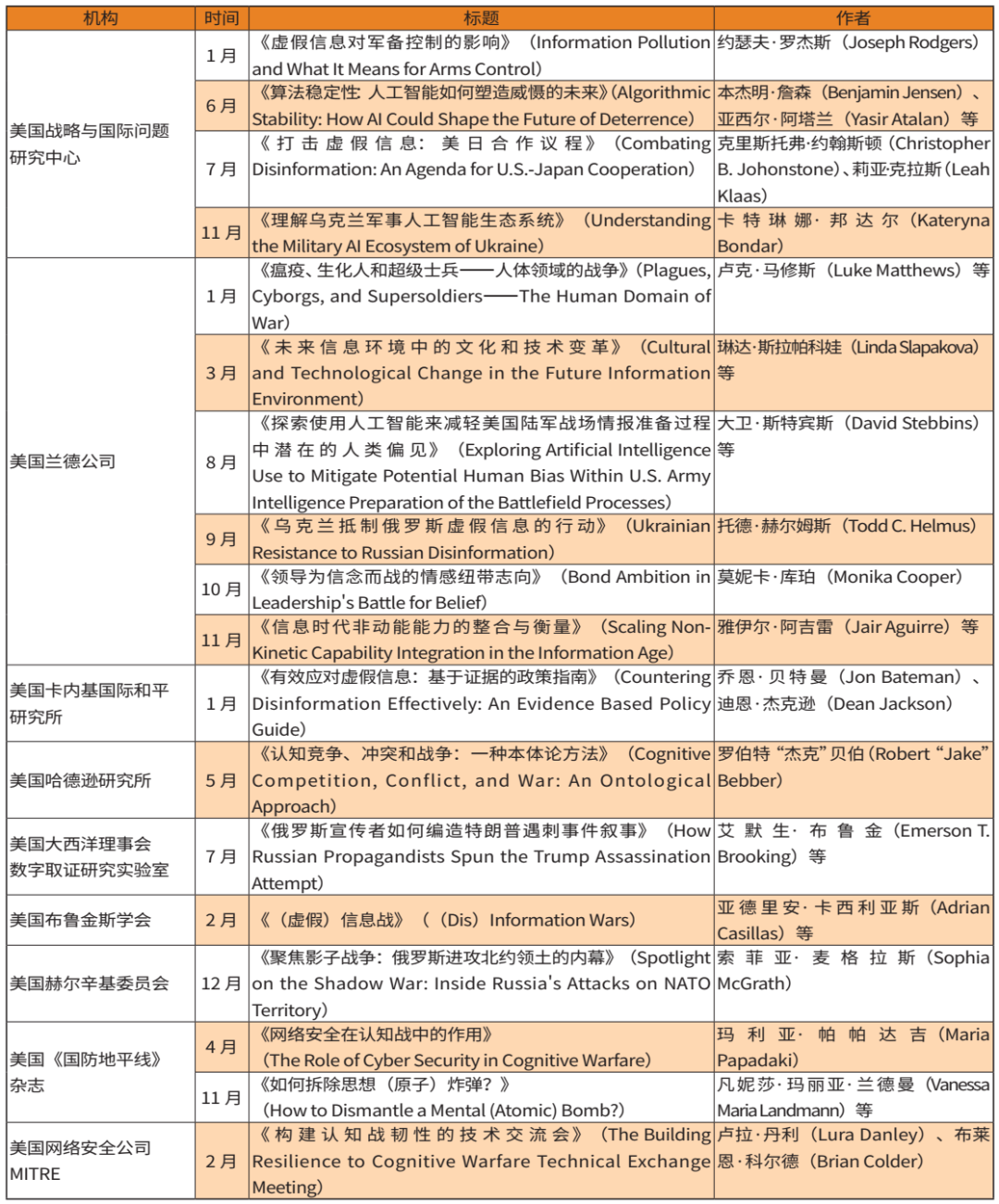 据“天闻”舆情系统和谷歌检索结果初步统计,2024年,美国智库发布认知域相关研究报告逾40篇,涉及哈德逊研究所、大西洋理事会、兰德公司、战略与国际问题研究中心、卡内基国际和平研究所等美国顶尖智库。基于宾夕法尼亚大学2020年美国智库影响力排名,结合美国知名网络安全公司等机构研究,通过系统性筛选(排除仅附带提及认知域的非专题报告),最终选取18篇相关报告作为分析样本(详见下表)。