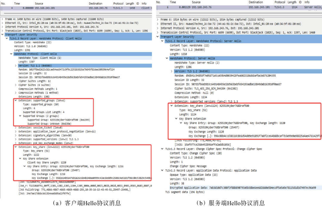 在TLS1.3的握手流程基础上,扩展支持基于PQC的混合密钥交换机制。客户端在 ClientHello消息的support_group字段中增加量子安全混合密钥交换密码组,如X25519Kyber768;同时,在KeyExchange字段包含选择的密钥协商算法所需的密钥。假设Key Share Entry字段中选择了X25519Kyber768混合密钥协商算法,那么KeyExchange字段中包含X25519算法的共享密钥参数和Kyber768算法的公钥信息,两部分数据根据密码组的顺序进行串联,具体见图2(a)。服务端在收到ClientHello消息后,回复ServerHello信息。在ServerHello信息中的扩展字段key_share中Key Share Entry字段选择密钥协商算法X25519Kyber768,KeyExchange字段中包含X25519算法的共享密钥参数和Kyber768基于公钥加密生成的密文,两部分数据根据密码组的顺序进行串联,具体见图2(b)。双方基于混合密钥交换方式协商出两个共享密钥,并进行拼接处理生成最终的会话密钥。