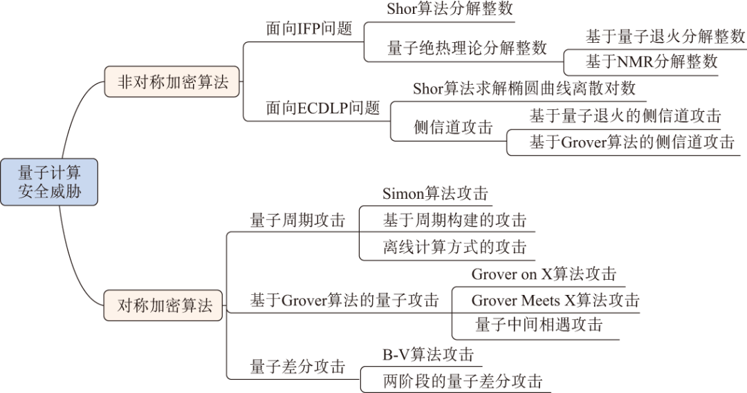 量子计算的快速发展对传统公钥密码体系构成威胁,尤其是RSA算法。Shor算法能够在量子计算机上高效解决大整数分解问题,直接威胁RSA算法的安全性。此外,量子计算还通过侧信道攻击对ECC算法构成威胁。相比之下,对称加密体制受量子计算影响较小,但增加密钥长度可增强其安全性。量子计算对传统加密体系的安全威胁如图1所示[6]。RSA算法安全性基于大整数分解问题,但1994年Shor算法的提出,可在量子计算机上高效解决该问题并具有指数级加速优势,严重威胁RSA安全[7]。目前,量子计算机尚未对大规模RSA密钥构成实质威胁,但随着技术的进步,威胁将持续加剧。此外,利用绝热量子计算进行RSA公钥破解也是方案之一,但存在局限性[8]。量子计算同样威胁ECC算法的安全性,可通过Shor算法或侧信道攻击实现[9]。在对称加密体制中,量子计算威胁较小,Grover算法虽能使对称密钥安全强度减半[10],但增加密钥长度可提升其安全性。总体而言,量子计算对非对称加密体制威胁大,可能彻底攻破其安全性,而对对称加密体制影响相对较小。尽管量子计算技术尚未成熟,但其潜在风险不容忽视,存在“先存储,后破解”的风险[11]。