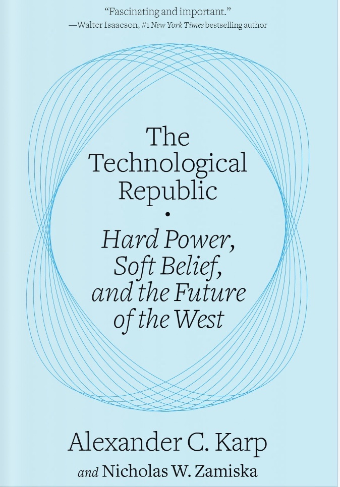亚历克斯·卡普将“爱国科技”阐述为硅谷自由主义与威权民族主义的某种融合。这种植根于反民主哲学的意识形态将技术至上视为文明的必然要求。他认为,美国人现在面临的挑战是围绕国家的共同目标,通过引导一种冷酷的实用主义,来重建一个“技术共和国”。而只有当每个人承担起定义“我们是谁”或“我们渴望成为谁”的风险时,我们才能确定这些共同目标。也就是说,对信念的忠诚需要看自己愿意为之付出多少代价。
