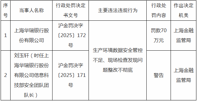 《银行科技研究社》(作者 木子剑):10月11日,国家金融监督管理总局上海监管局发布的行政处罚信息显示,上海华瑞银行因“生产环境数据安全管控不足、现场检查发现问题整改不彻底”等主要违法违规行为,被罚款70万元。