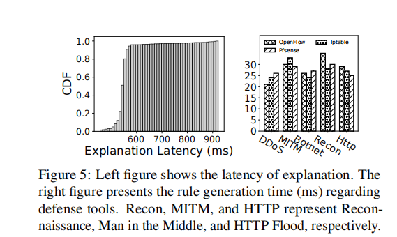 效率:解释延迟 90% 以上低于 600ms,规则生成平均延迟约 25ms(OpenFlow 最大 35ms),满足实时响应需求。