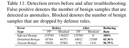错误排查:针对不同误报类型生成优化规则,使受感染良性流量的误报率降为 0,未见过的良性流量误报率降低 96.79%,干扰性良性流量误报率降低 65.36%。