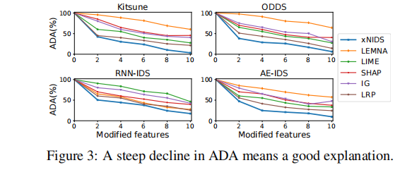 保真度:通过描述精度(DA)衡量解释与 DL-NIDS 决策的一致性。实验显示,修改 XNIDS 识别的关键特征后,平均描述精度(ADA)下降最显著(如图 3 所示),且其 AUC 值(曲线下面积)在所有 DL-NIDS 上均最低(Kitsune 为 0.316,ODDS 为 0.325),表明其筛选的特征与检测结果关联性最强。