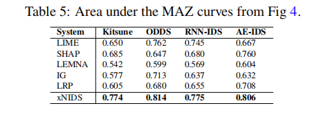 稀疏性:采用零附近质量(MAZ)评估,XNIDS 的 MAZ 曲线在零附近斜率最陡,AUC 值最高(Kitsune 为 0.774,ODDS 为 0.814),说明其能用最少的关键特征实现有效解释,远超 LEMNA(Kitsune 为 0.542)等方法。