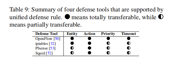工具适配性:统一规则可完全转换为 OpenFlow 规则,部分转换为 iptables、Pfsense、Squid 规则,支持异构防御工具,而现有方法(如 FIRMA)仅支持特定工具。