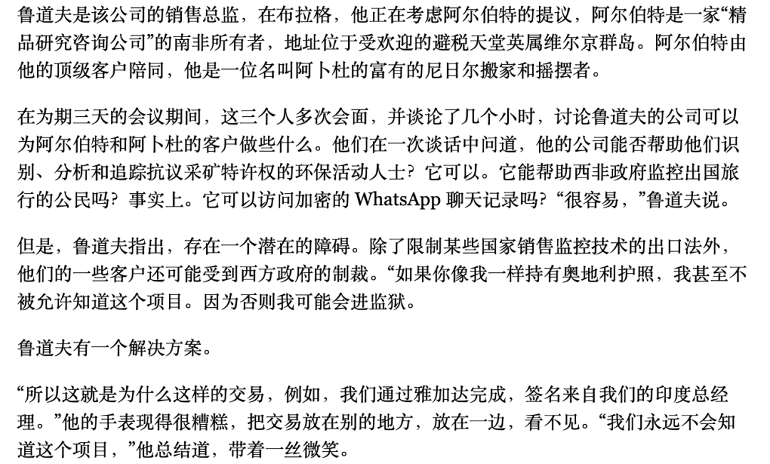 - 活动人士:诺贝尔和平奖提名人Benny Wenda,以及南非环保抗议者。公司甚至向受制裁的矿业公司推销追踪环保活动人士的功能。