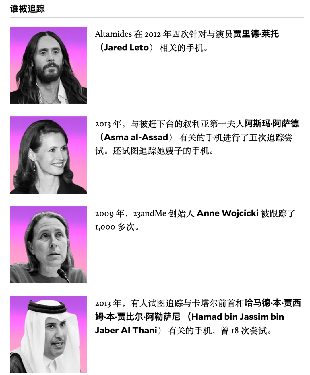 此外,还有普通人被卷入,如一位俄罗斯移民Sophia被私人追踪近一年,从英国到印度。名人如演员Jared Leto和奥地利流行歌手Wolfgang Ambros也榜上有名。这些追踪往往用于个人骚扰、企业间谍或政治XX(黑鸟水印)。
