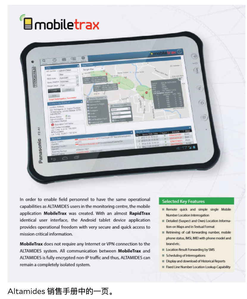 First WAP声称Altamides仅供执法机构用于打击有组织犯罪、恐怖主义和腐败,但调查显示,它已被广泛滥用于商业间谍、私人跟踪和政治镇压。该平台通过现场硬件安装或网络门户访问,价格从100万美元的基本版到1500-2000万美元的全功能版不等。