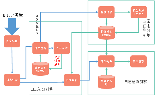 检测模块框架包含日志初分、正常日志学习和日志检测三大引擎。首先,流量分发至日志过滤和判断环节:日志过滤将流量与规则库对比,若匹配则传入学习引擎,否则转人工分析;人工确认正常后,提取规则并加入规则库,否则直接过滤。日志判断则验证模型是否存在。其次,学习引擎对正常HTTP日志按字段提取特征,构建模型存入数据库;新日志进入时,其特征与库中模型比较,差异则实时更新模型。最后,检测引擎提取所有HTTP日志字段键值对,与规则知识库及模型数据库的特征进行对比,对不符合特征的日志触发告警。整个系统实现自动化检测与动态模型优化,确保异常流量高效识别。