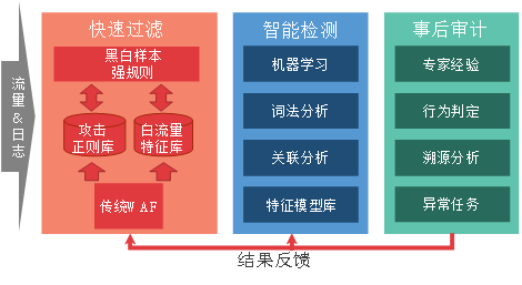 首先,在快速过滤层,基于黑白样本强特征将绝大部分的初始网络流量与日志过滤。其次,将过滤后的网络流量传到智能检测层,通过机器学习、关联分析等AI方法。再次,进行检测与筛选。最后,对于仍难以判定黑白的流量,通过事后审计层,由技术专家来判断,将分析结果反馈给前两层,迭代优化前两层的过滤规则与模型参数。