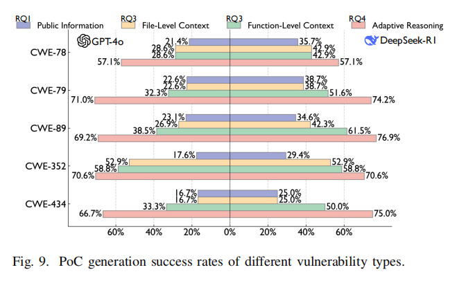 4. 实证与理论启示:揭示LLM可直接由公开描述或部分上下文自动拼接出有效漏洞利用PoC,突破传统模板或符号执行瓶颈。通过上下文与推理增强,显著提升多种漏洞类型的利用成功率,为攻防技术、快速回归测试和漏洞响应提供新范式,同时对信息披露政策和生成式能力扩散提出政策新挑战。