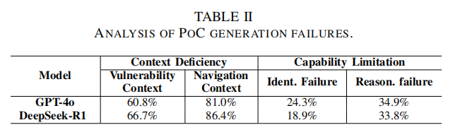 论文在讨论与局限分析中高度坦诚地指出:首先,实验只覆盖了最常见的五大CWE类型Web漏洞,未来亟需拓展至更加多样化、逻辑复杂的新型漏洞类别,并完善分步骤推理与提示工程的泛化适配能力。其次,输入信息的丰富性与选择性对PoC生成效果有直接影响。虽然上下文补全普遍正向提升生成成功率,但过度或无关上下文亦可能引入噪音,如何高效筛选关联内容、构建可复用知识库仍需深入研究。