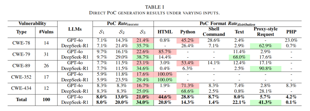 论文简介:本文系统性评估了大语言模型(LLMs)在Web应用程序漏洞PoC(Proof-of-Concept)生成任务中的能力及局限性。面向真实安全实践,作者围绕CVE公开流程的三个典型阶段(仅描述、补丁发布、源代码全公开),构建了100个可复现Web漏洞的高质量基准,全面测试了GPT-4o和DeepSeek-R1两类大型语言模型。