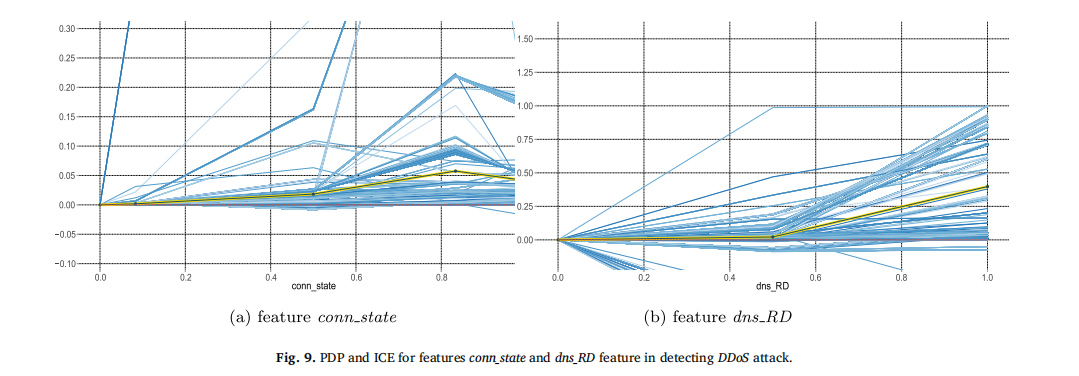 PDP 的全局趋势可视化:绘制特征值与模型平均预测结果的关系曲线,揭示整体规律。例如,针对 DoS 攻击,PDP 显示 “duration”(连接时长)超过阈值后,攻击概率急剧上升,且可区分不同数据组的响应差异(如部分记录在阈值处概率跳升 50%,另一部分跳升 80%)。