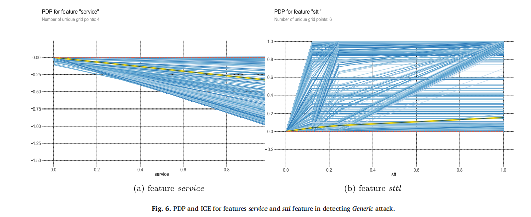 PDP 的全局关系可视化:绘制特征值与模型平均预测结果的关系曲线,展示特征对全局决策的影响趋势。例如,针对 Generic 攻击,PDP 显示 “service” 特征值升高时,模型判定为攻击的概率显著下降,且可区分出受该特征影响程度不同的两类数据记录(下降 10% vs. 下降 90%)。