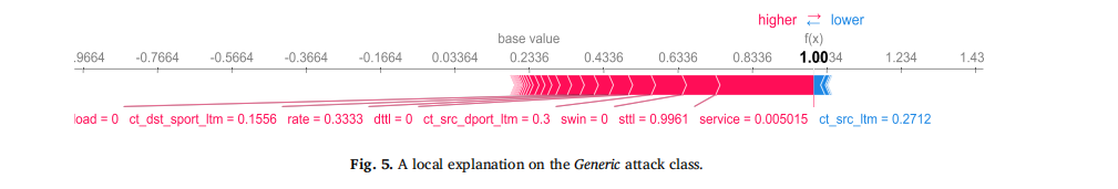 全局解释的合理性:PFI 和 SHAP 识别的关键特征与攻击特性一致。例如,DDoS 攻击中 “conn_state”“dns_RD” 被列为核心特征,与实际攻击中连接状态异常、DNS 递归请求频繁的特点吻合;Generic 攻击中 “service”“swin” 的高重要性,匹配其依赖特定服务端口和 TCP 窗口值的行为。