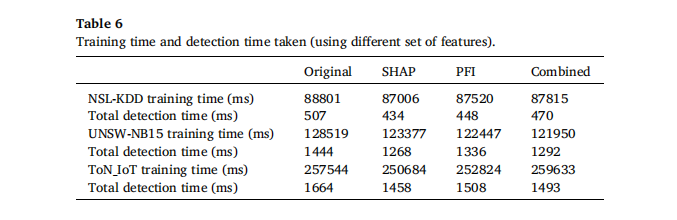 PFI 特征子集:UNSW-NB15 的 Recall 提升至 0.990(原始特征 0.988),NSL-KDD 的训练时间从 88801ms 缩短至 87520ms。