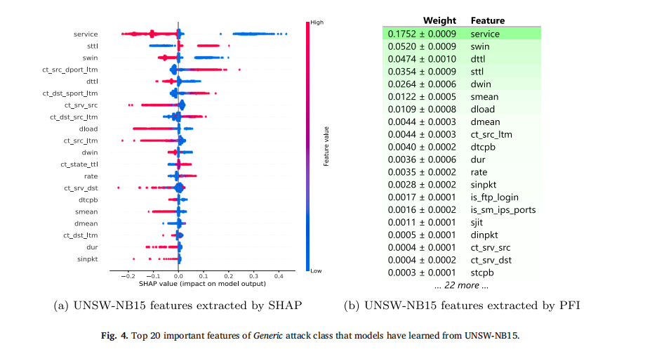 PFI 的特征重要性排序:通过随机置换特征值并计算模型误差变化,评估特征的全局重要性。例如,在 UNSW-NB15 数据集上,PFI 发现 “swin”“dttl” 等特征置换后模型误差显著上升(权重分别为 0.0660、0.0449),确定其为核心特征。