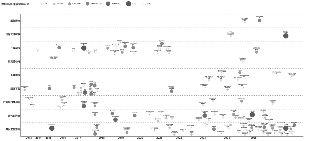 奇安信威胁情报中心对报告中涉及的供应链相关实际案例根据其涉及环节、事件披露年份和影响面的大小形成了如下图示,使读者对这些事件有个比较直观的对比: