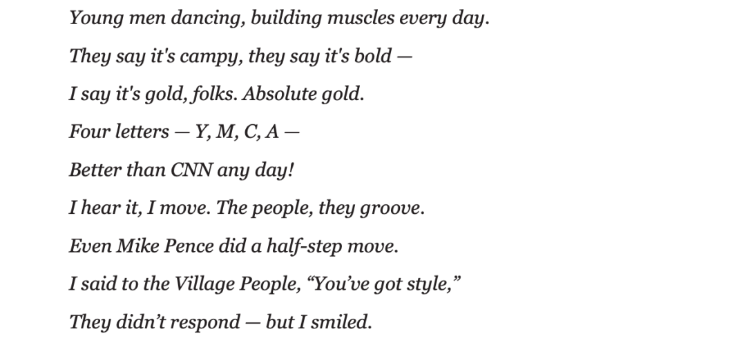 一段“特朗普风格”的幽默诗作,内容夸张地描绘了前总统对“村民基督教青年会”的热爱,以其标志性的意识流和自夸笔触书写。