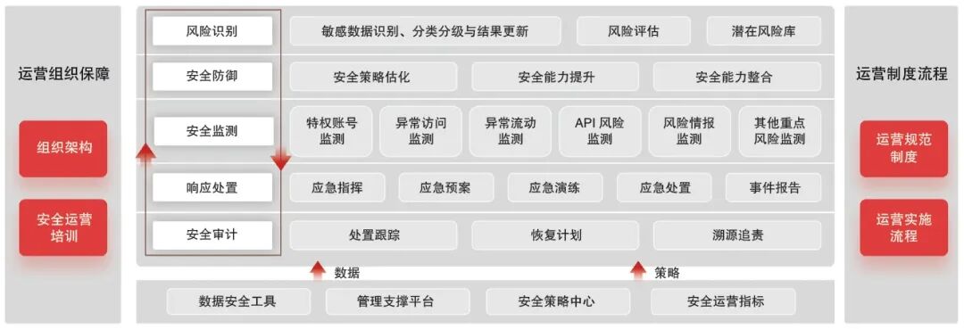 对于金融机构而言,数据安全保障体系需要提供长期、稳定的服务,其中管理办法、技术工具等是手段,而核心关键则在于如何运营。对此,金融机构可通过以组织架构、制度流程、技术工具为框架支撑,不断加强整体能力建设,并从风险识别、安全监测、响应处置等维度构建运营能力域,有效实现事前识别与防御、事中监测与响应、事后恢复与追责,进而逐步建成高效运转、持续服务的数据安全运营体系,确保数据全生命周期的安全可控和闭环防护。
