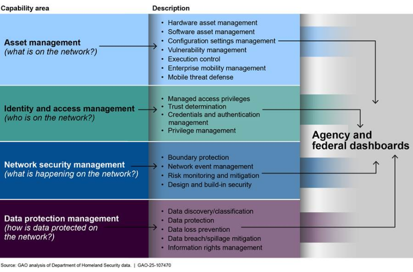 报告指出:“这些仪表盘旨在将各个能力领域的信息可视化,从而深入了解与资产、用户、网络和数据相关的网络安全态势。然而,23个民事机构中,有21个的官员表示,他们尚未完全实施网络安全管理和数据保护管理领域的能力。据几家机构的官员称,他们正在等待CISA就这些能力提供更多指导。”
