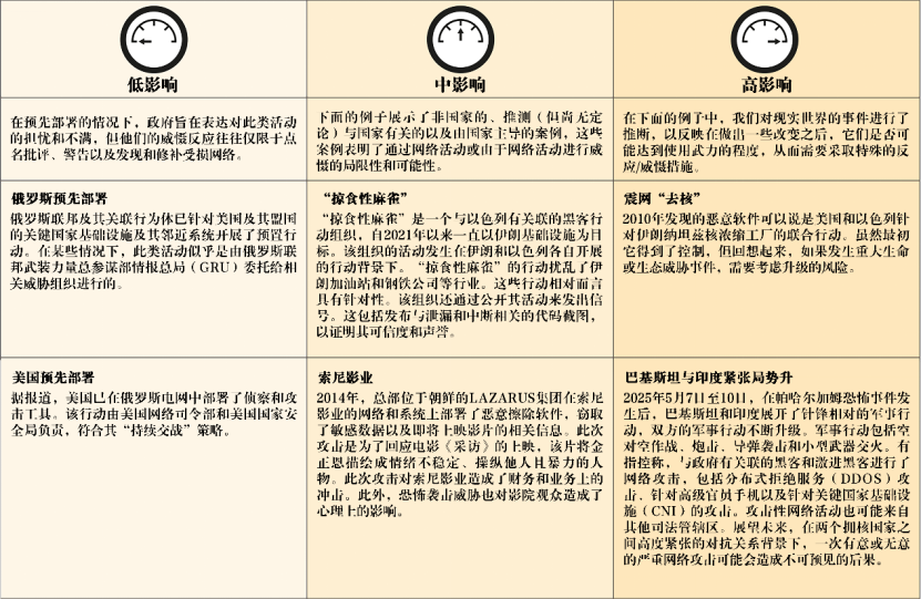 两次演习都基于一个前提:政治意愿和背景可以说是威慑机制选择和态势变化的最决定性因素。表1展示了迄今为止网络行动的简化图谱,包括低影响、中影响和高影响示例。