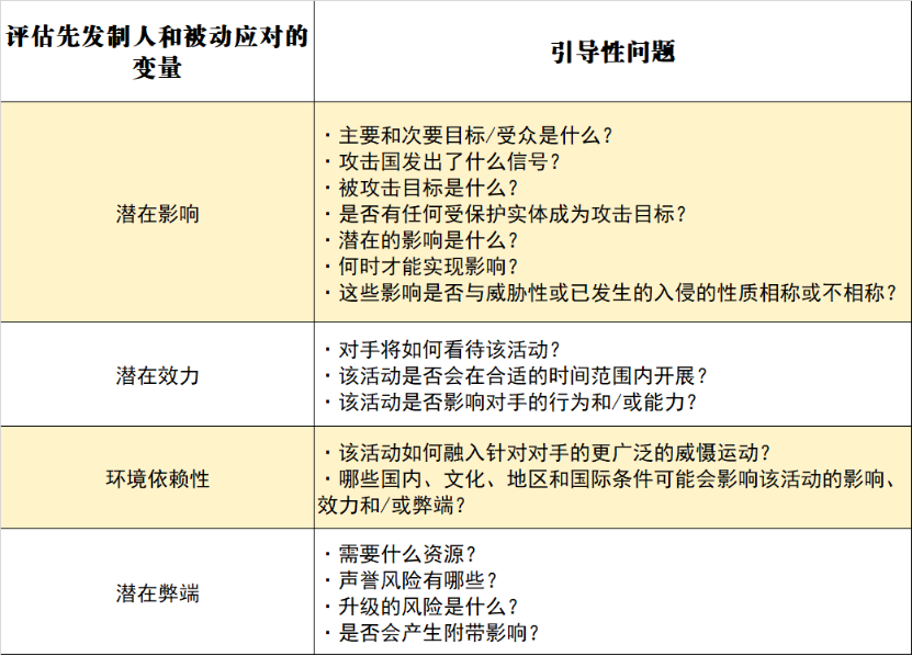 关注中间地带,可以避免对假设的“重大事件”进行无益的框架构建,同时发挥两个重要作用。首先,可以根据行动(及其影响)的严重程度进行划分,并客观地与非网络行动进行比较。例如,勒索软件威胁造成了巨大的经济影响,但其本身的影响仍然有限,不足以构成战争行为。这就引出了第二点:可以基于对特定行为体的潜在影响和有效性、背景依赖性以及弊端,根据累积威慑观点提出并评估先发制人和被动应对的“菜单”。根据跨域方法,该措施应同时包含网络和非网络选项。政策制定者还应考虑表2中的问题——这些问题并非详尽无遗。