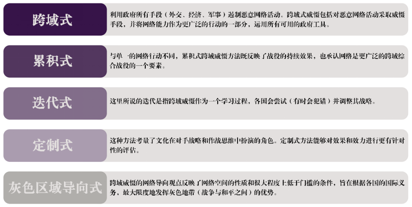 有必要简要评估有助于弥合网络威慑“言行”差距的概念贡献和挑战。探索这些概念有助于缩小差距。过去几年,政策和学术文献中至少出现了五种主要思想流派: