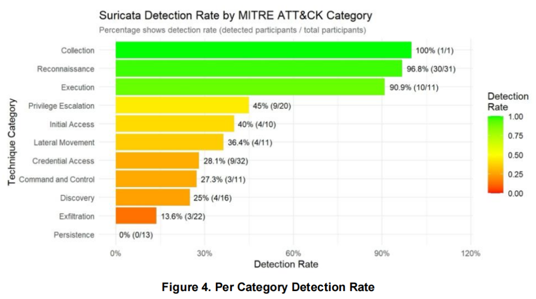 但在依赖主机内部、会话暂不可见或认知主导的阶段(如持久化、命令与控制、敏感信息导出等),受限于网络流量观测天然短板,Suricata日志分析法召回率相较OPNOTES明显减弱。不过模型在行为判别时依然具备稳定的泛化能力,能充分挖掘网络层可观测的所有攻击迹象。分技术类别来看,侦察、横向移动等外部可见性强的阶段基本与OPNOTES推断结果一致,而如持久化、命令控制与数据导出则往往在OPNOTES有丰富记载,Suricata日志层面难以直接推断。可理解的是,这种结果反映了“观测界限决定推理边界”的本质——只有被网络传感器感知的数据才能被模型捕捉。