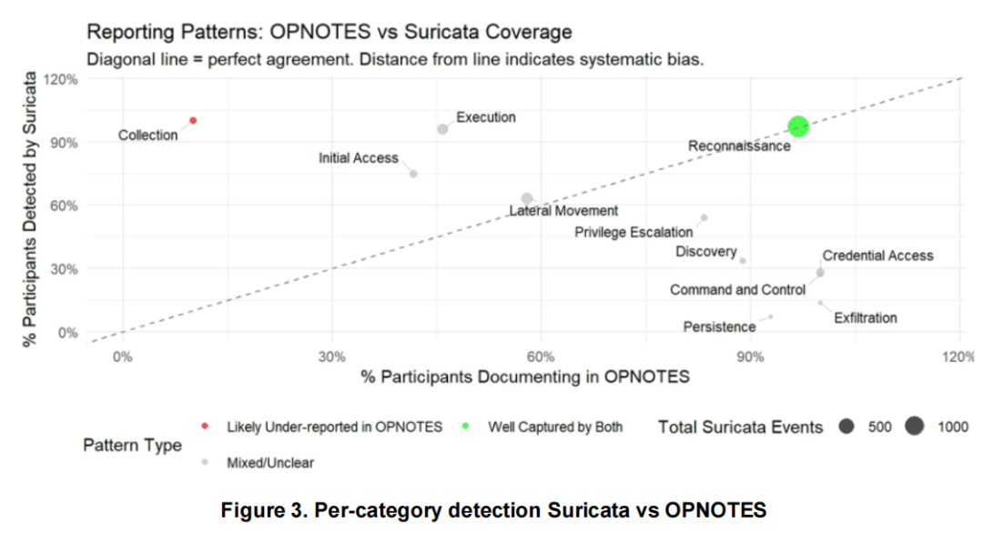在验证阶段,作者以OPNOTES(人类自述操作笔记)推断结果为理想“上限”,将仅依赖机器网络日志与全知人类记录的战术推理准确性进行了系统对比。总体上,Suricata + LLM方法在绝大多数攻击阶段展现出高精度,尤其是在网络流量可观测(如侦察、横向移动、数据收集等)存在明显流量特征的环节,模型提示的ATT&CK标签与OPNOTES高度重叠,战术覆盖率接近基线。