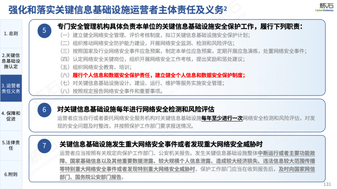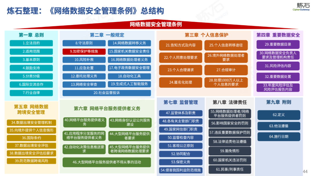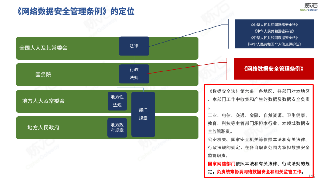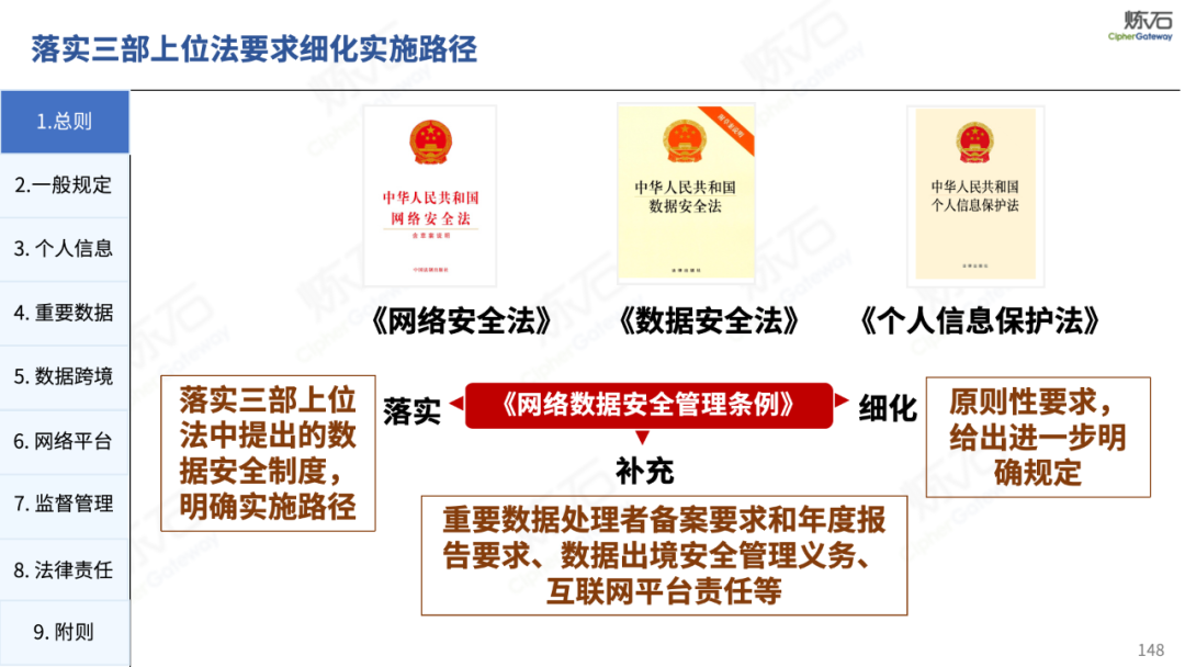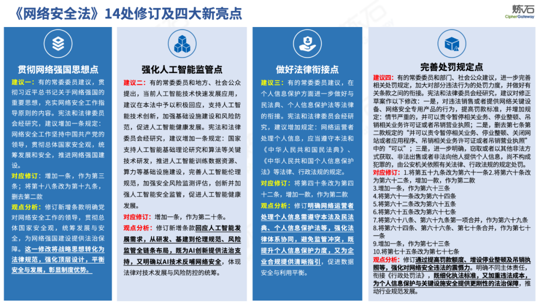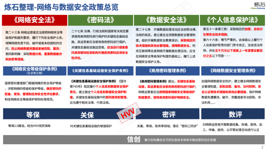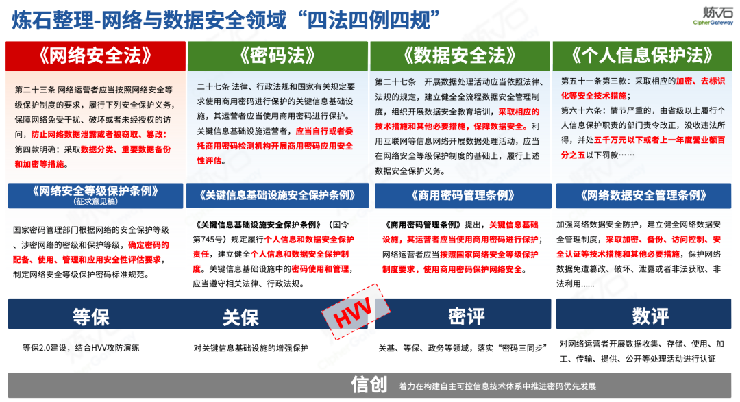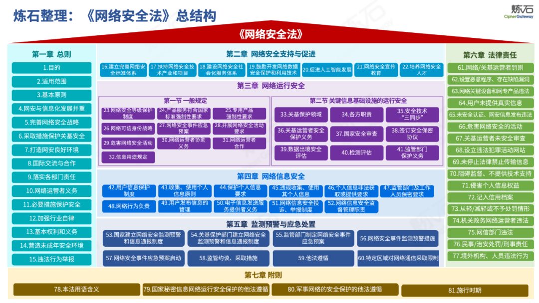 炼石通过幻灯片图解形式,对《网络安全法》的新法框架、修订重点与合规要求进行了系统梳理,并进一步图解了“三法三条例”,即《密码法》《数据安全法》《个人信息保护法》《关键信息基础设施安全保护条例》《商用密码管理条例》《网络数据安全管理条例》。旨在帮助读者更好地理解相关法规的主要内容,为网络和数据安全合规及实战建设提供参考。由于作者水平有限,欢迎业界同仁共同探讨完善。