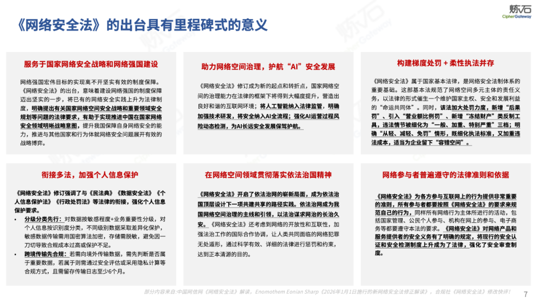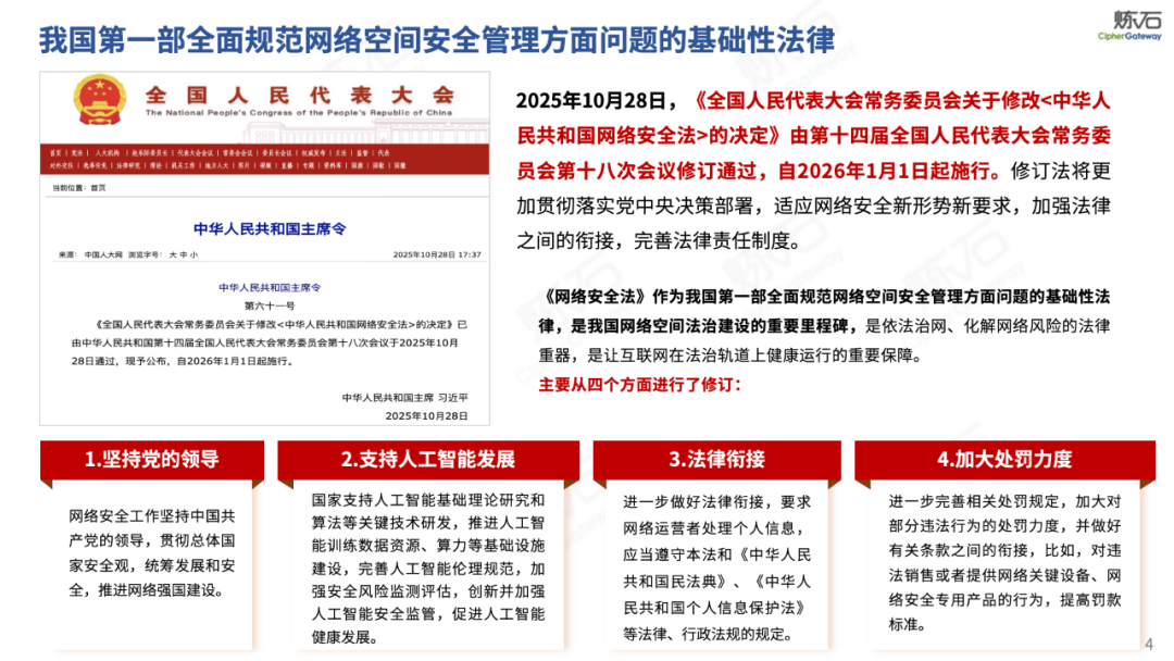 聚焦关基重要数据保护,细化法律保障机制。修订后的法律进一步细化了关键信息基础设施保护制度,优化了认定机制与保护要求,同时加强了数据分类分级管理,完善了重要数据出境安全评估等制度安排,为保障国民经济命脉、维护社会稳定运行提供了更加精准的法律指引。